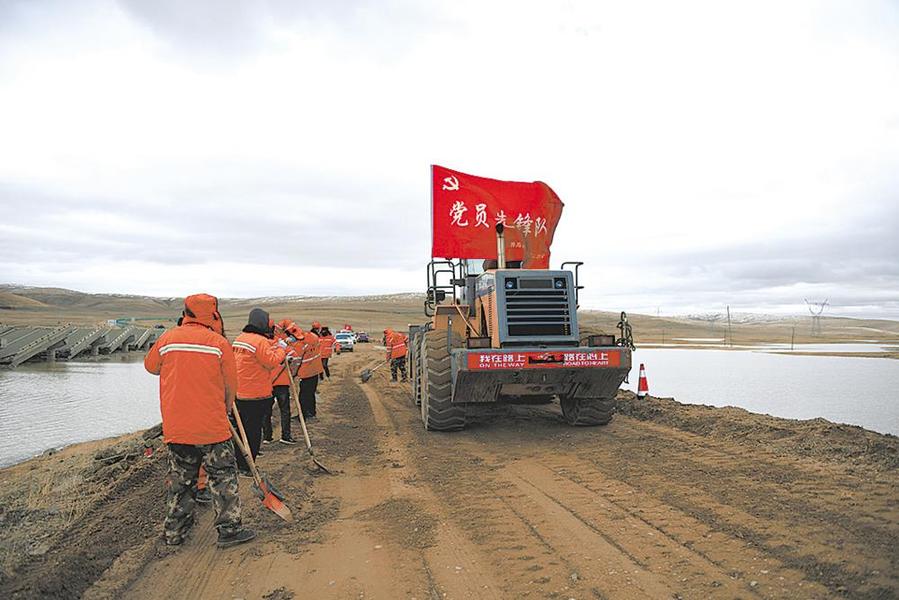 黃河沿公路段職工平整公路。記者 張多鈞 公保安加 殷之皓 程宦寧 攝