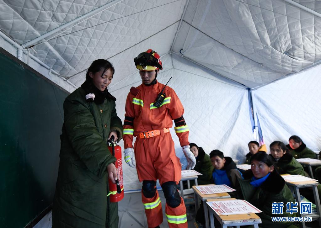 5月24日,青海果洛州消防救援支隊(duì)隊(duì)員在指導(dǎo)曲邁卓瑪(左一)學(xué)習(xí)防災(zāi)避險(xiǎn)知識(shí)。新華社 張龍 攝