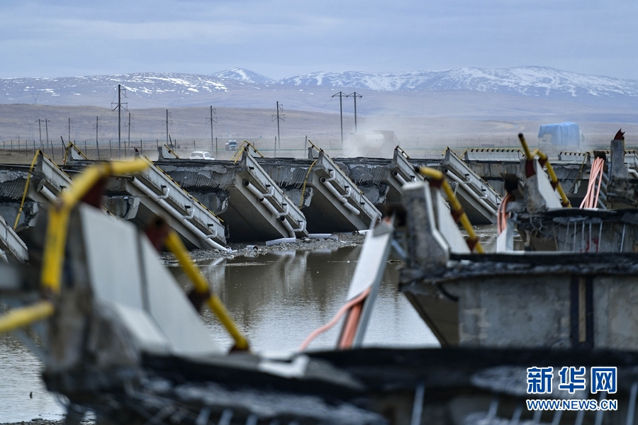5月22日瑪多地震造成G0613西麗高速野馬灘大橋雙向坍塌。圖為5月26日航拍的野馬灘大橋。