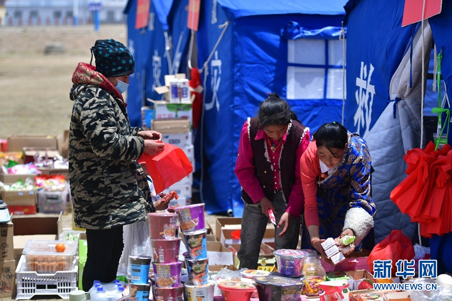 為穩(wěn)定市場秩序,方便居民生活,瑪多縣市場監(jiān)督管理局從5月23日開始,搭建臨時帳篷市場,服務(wù)群眾。5月26日,兩名受災群眾在瑪查理鎮(zhèn)安置點的帳篷超市選購商品。