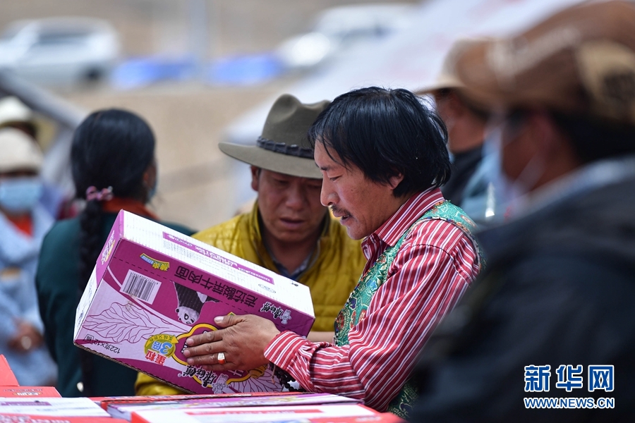 5月26日,瑪多縣扎陵湖鄉(xiāng)安置點內(nèi),受災群眾在領(lǐng)取救災物資。