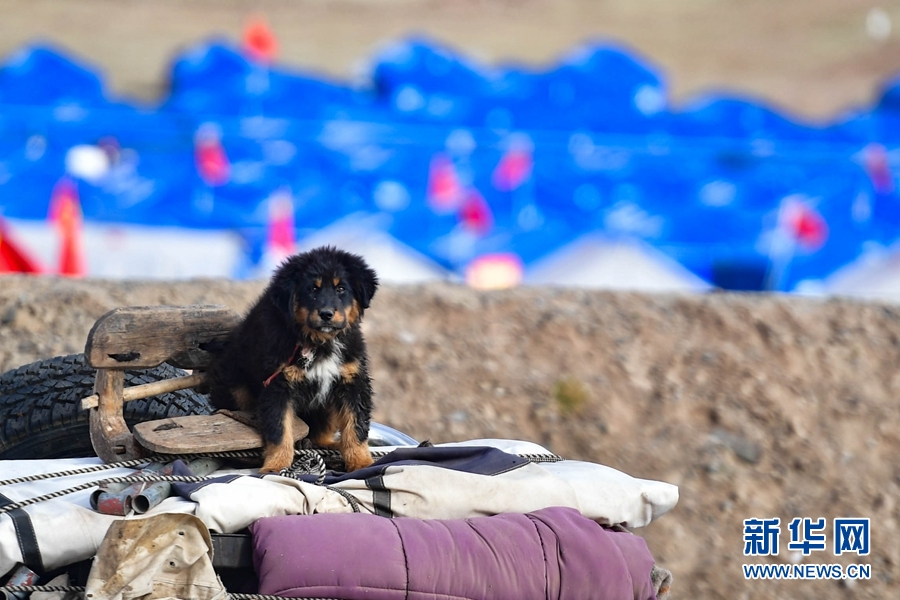 5月26日,一名受災群眾將家中的物資和狗狗拉至瑪多縣黃河鄉(xiāng)安置點。