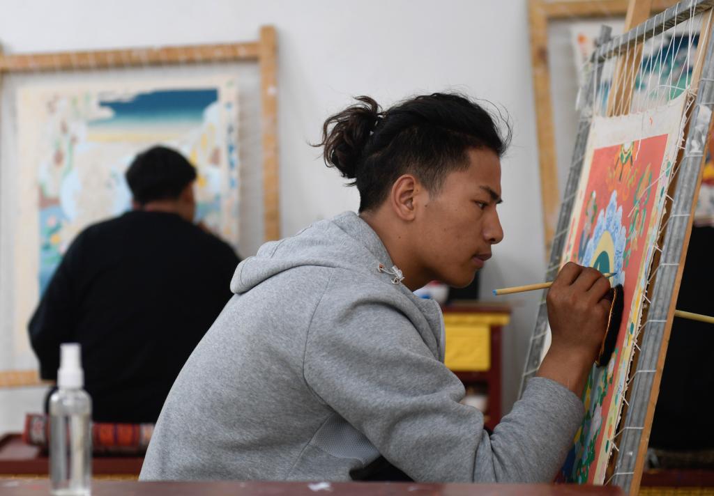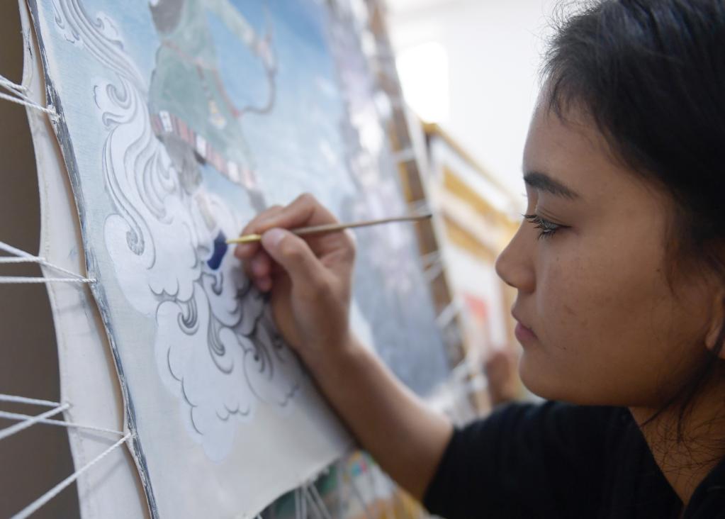 6月17日,在青海民族大學(xué)藝術(shù)學(xué)院,工藝美術(shù)(唐卡)專業(yè)學(xué)生在繪制唐卡。新華社記者 張曼怡 攝