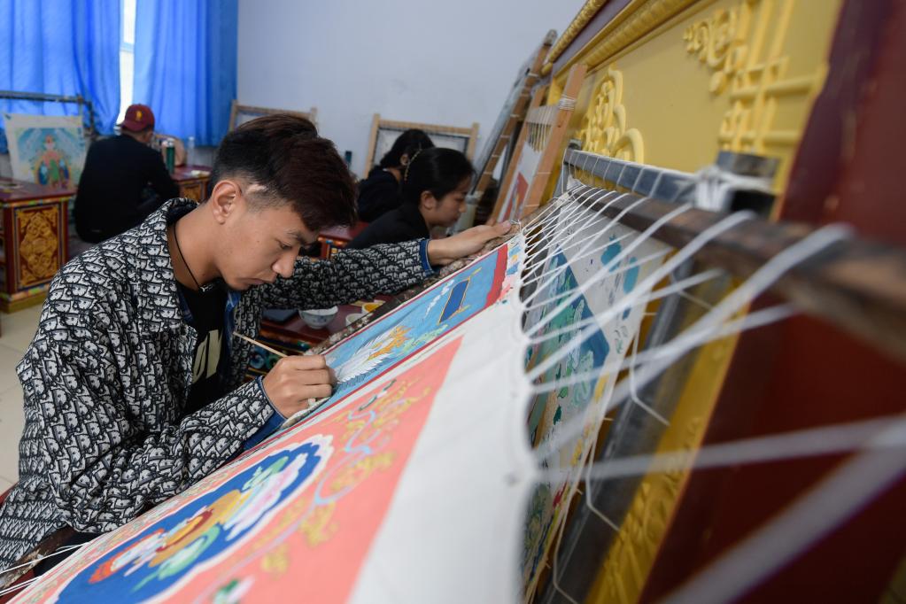 6月17日,在青海民族大學(xué)藝術(shù)學(xué)院,工藝美術(shù)(唐卡)專業(yè)學(xué)生在繪制唐卡。新華社記者 張龍 攝