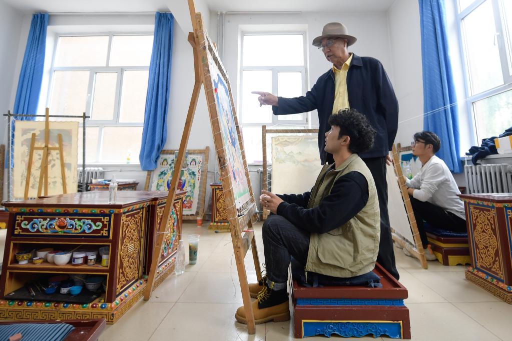 6月17日,在青海民族大學(xué)藝術(shù)學(xué)院,老師夏吾才讓(中)在指導(dǎo)工藝美術(shù)(唐卡)專業(yè)學(xué)生繪制唐卡。新華社記者 張龍 攝