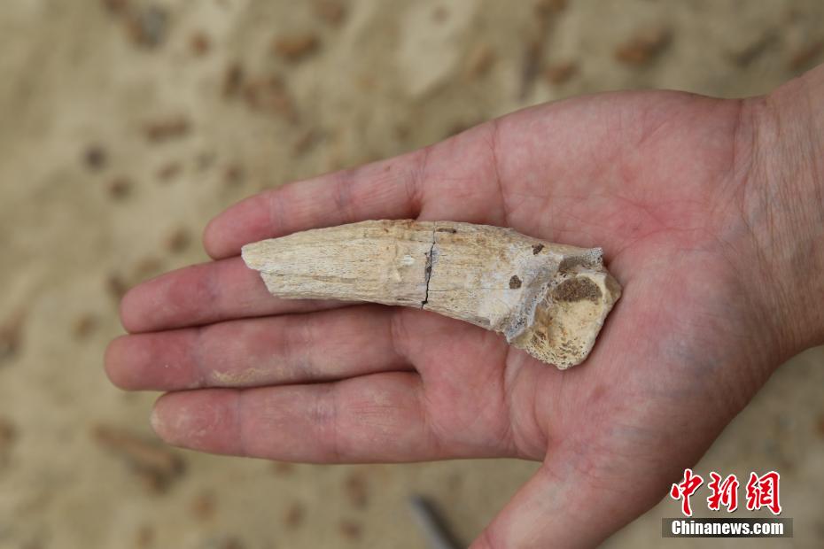 專家表示,本次發(fā)現(xiàn)的3處化石產(chǎn)地為產(chǎn)出地區(qū)區(qū)域地史演化研究、古地理環(huán)境分析、地層時代厘定等提供了重要科學依據(jù)。圖為真象腿骨化石。 保廣普 攝