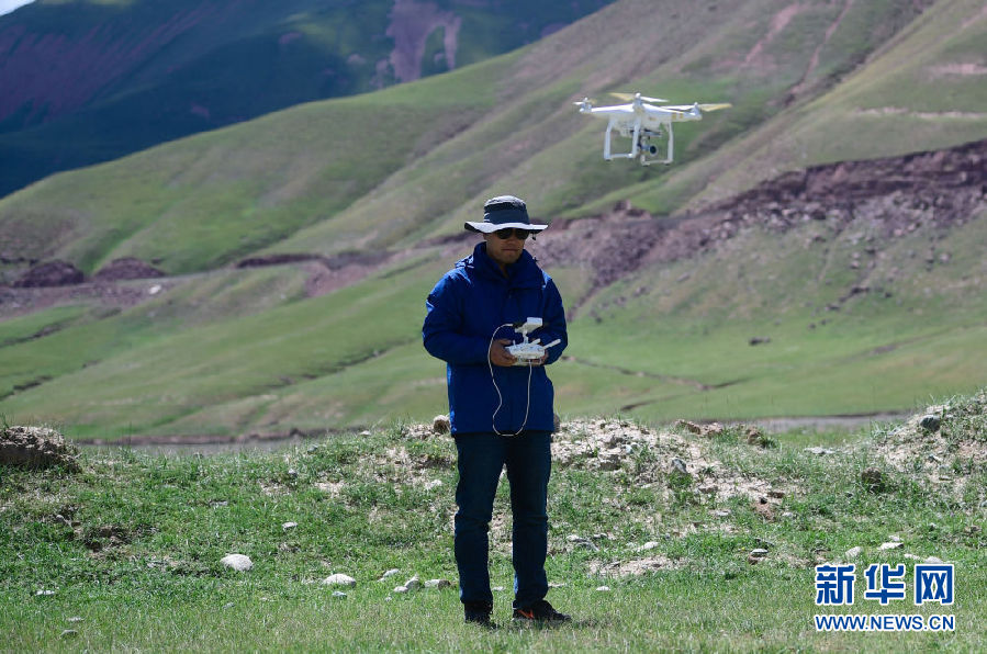 2021年長江源綜合科考的科考隊(duì)員趙保成在使用無人機(jī)觀測長江源地區(qū)生態(tài)環(huán)境(7月24日攝)。新華社記者 張龍 攝