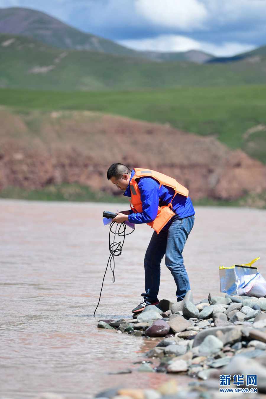 2021年長江源綜合科考的科考隊(duì)員趙良元在通天河流域觀測水文(7月24日攝)。新華社記者 張龍 攝