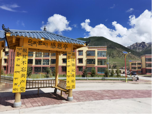 群山連綿、江河蜿蜒,雜花生樹、綠草如茵,距離縣城3公里,“牧人希望家園”靜靜矗立在瀾滄江源頭。走進大門,小區(qū)內(nèi)寬敞的廣場,配套設(shè)施齊全,刻著“感恩”紅色大字的石頭擺放在中央,還專門設(shè)有“感恩亭”,老人孩童,坐在一排排白墻紅瓦藏式風(fēng)格濃郁的三層小樓臺階上納涼,一派歡樂祥和景象。這里是海拔4200米青海玉樹藏族自治州雜多縣的一個易地扶貧搬遷安置點。我們今天走訪的對象是蘇魯鄉(xiāng)山榮村的東尕和巴宗。