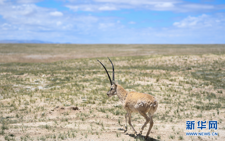 這是7月7日在可可西里索南達(dá)杰保護(hù)站野生動(dòng)物救助中心拍攝的一只被放歸自然的藏羚羊。新華社記者 張龍 攝
