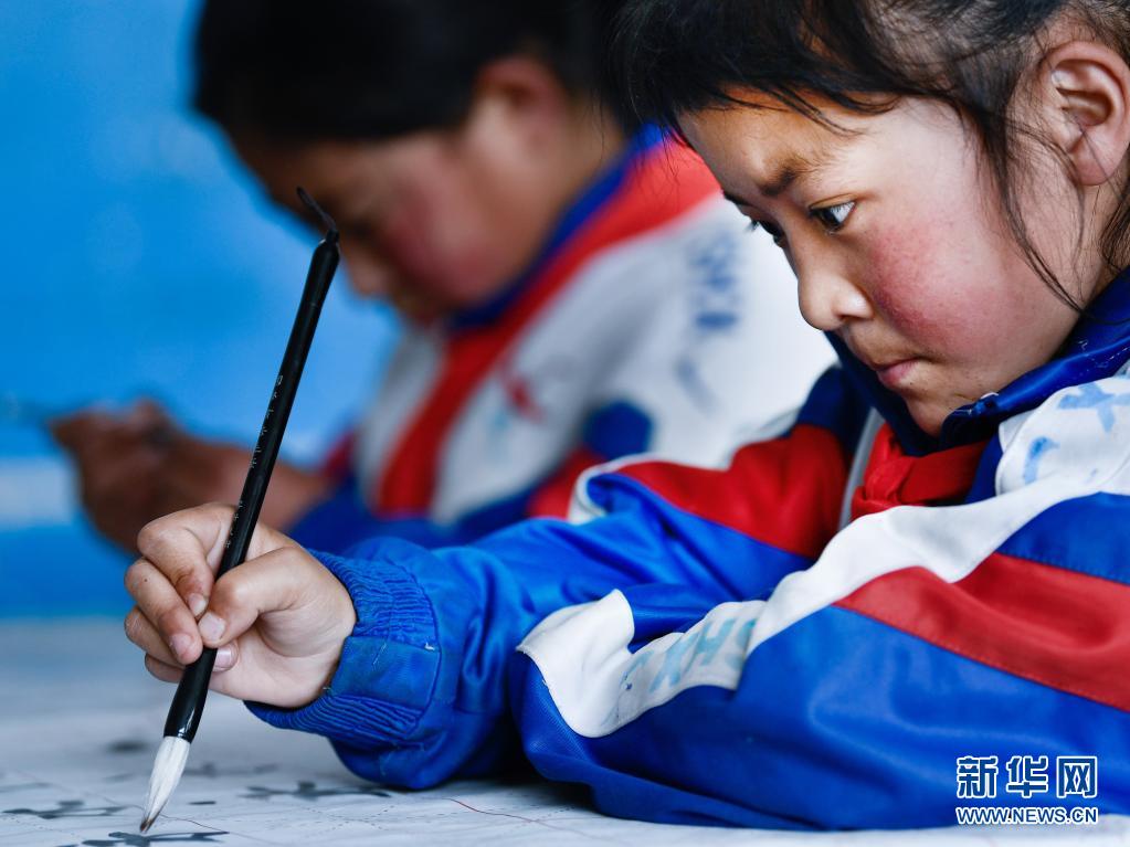 在玉樹(shù)藏族自治州紅旗小學(xué),學(xué)生在上書(shū)法課(3月19日攝)。新華社記者 張龍 攝