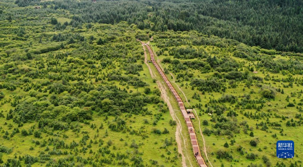 游客行走在扎尕那景區(qū)的木棧道上(8月28日攝,無人機照片)。新華社記者 杜哲宇 攝