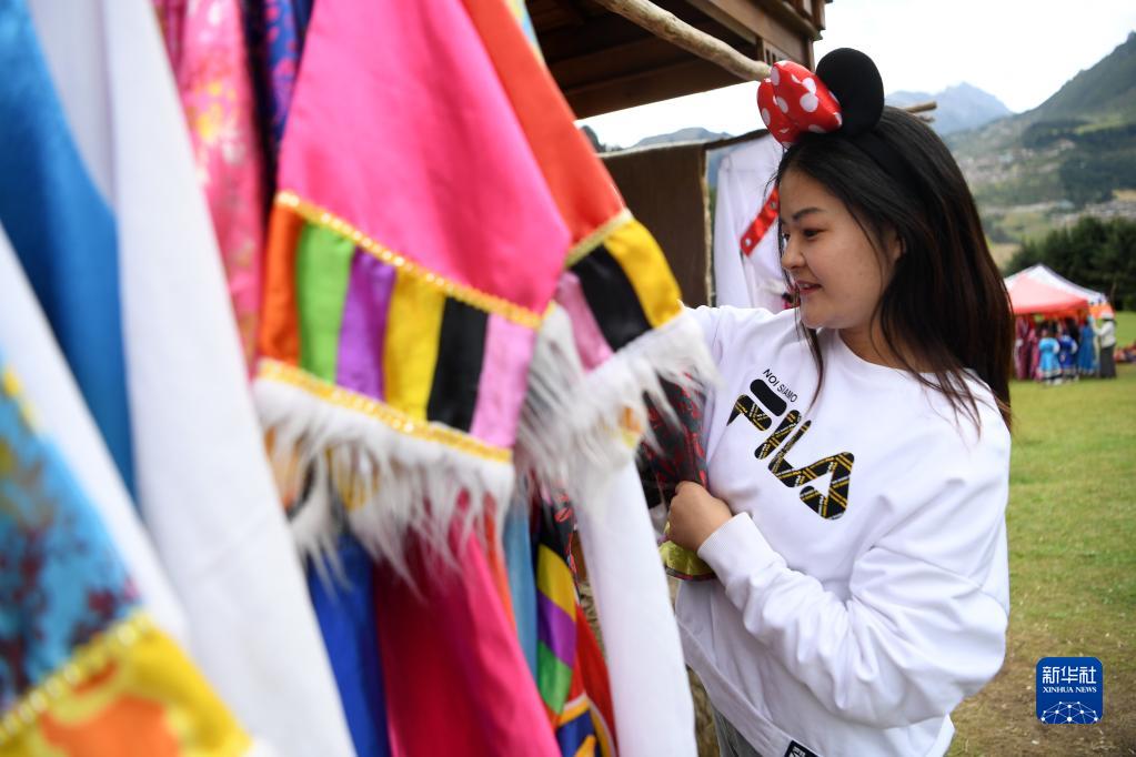 一名游客在扎尕那景區(qū)挑選藏族服飾體驗民族風(fēng)情(8月28日攝)。新華社記者 杜哲宇 攝