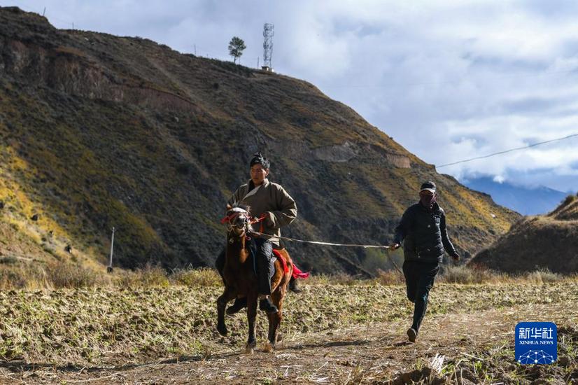 甘孜縣來(lái)馬鎮(zhèn)格通村村民在馴化從合作社購(gòu)買(mǎi)的幼馬(10月25日攝)。新華社記者 王曦 攝