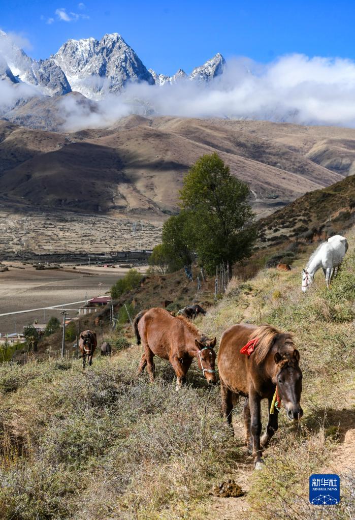 在甘孜縣來(lái)馬鎮(zhèn)格通村拍攝的馬群(10月25日攝)。新華社記者 王曦 攝