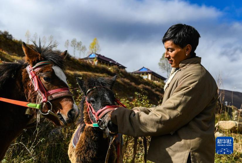 在甘孜縣來(lái)馬鎮(zhèn)格通村,村民在查看幼馬的生長(zhǎng)情況(10月25日攝)。新華社記者 王曦 攝