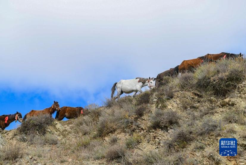 在甘孜縣來(lái)馬鎮(zhèn)格通村,馬群前往草場(chǎng)(10月25日攝)。新華社記者 王曦 攝