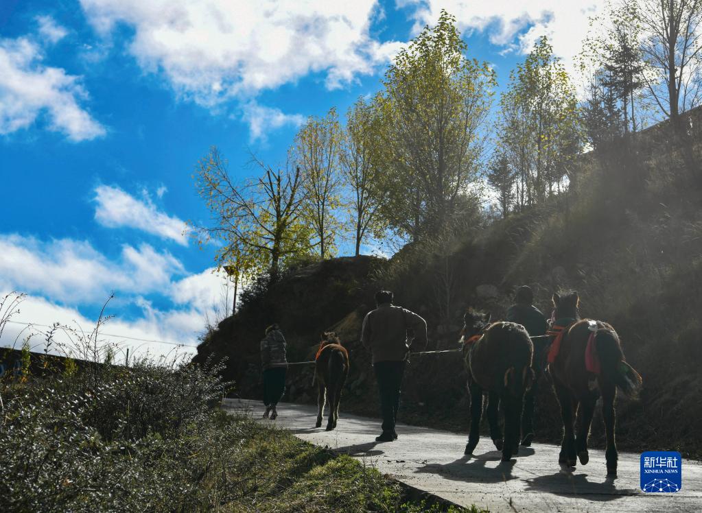 在甘孜縣來(lái)馬鎮(zhèn)格通村,村民將完成馴化訓(xùn)練后的幼馬帶回(10月25日攝)。新華社記者 王曦 攝