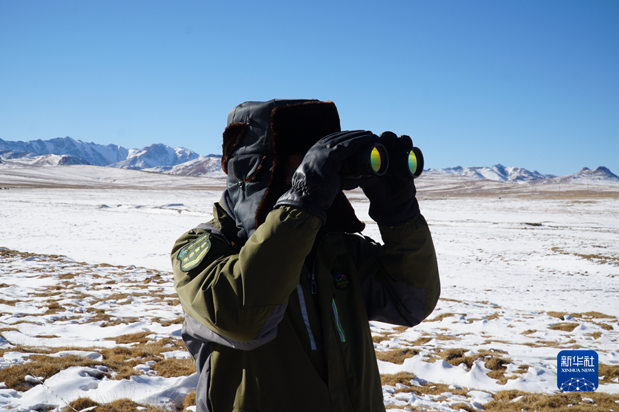 12月3日,祁連山國(guó)家公園沙龍灘管護(hù)站生態(tài)管護(hù)員楊有財(cái)用望遠(yuǎn)鏡觀測(cè)。新華社記者 耿輝凰 攝