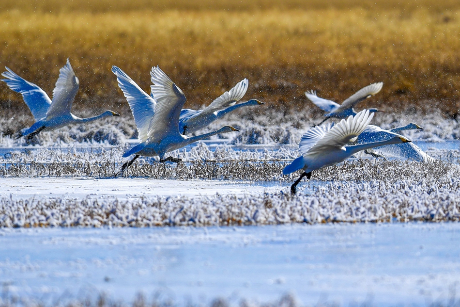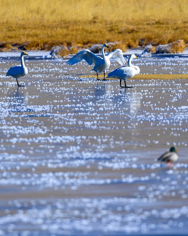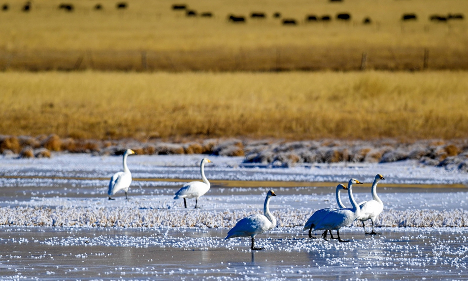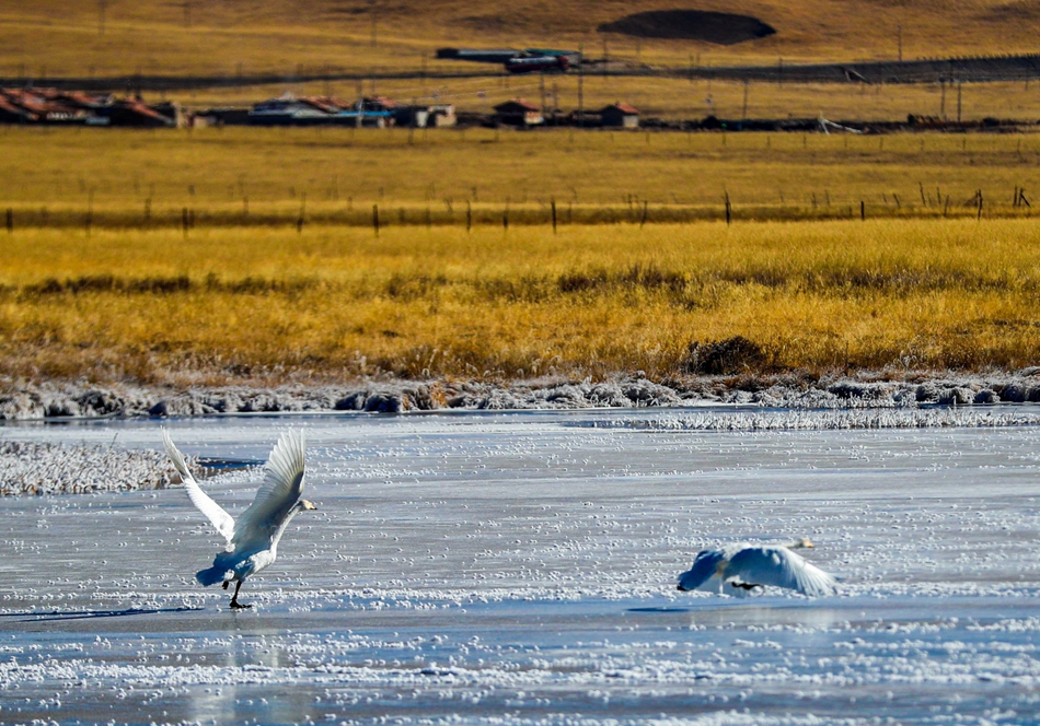 入冬以來,甘肅省甘南藏族自治州碌曲縣尕海濕地越冬的大天鵝浴雪歡歌,翩翩起舞,成為草原上一道獨(dú)特的風(fēng)景。
