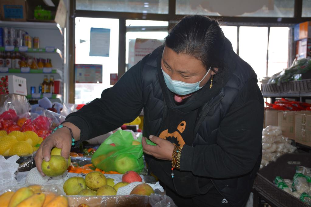 在青海省果洛藏族自治州瑪多縣的菜鋪內(nèi),當(dāng)?shù)鼐用袂|正在挑選水果。柳澤興 攝