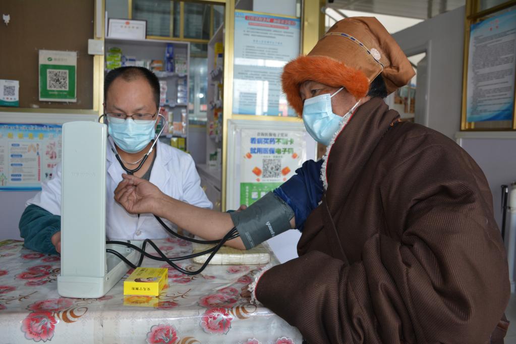 在一旁的復(fù)康診所內(nèi),日洛正在給生病的孫子買藥?!靶『⒆影l(fā)熱咳嗽,拿點感冒藥就行,記得一天吃三次。”等大夫說罷,日洛又挽起衣袖請大夫給自己量血壓?!霸\所開在家門口,頭疼腦熱買藥方便?,F(xiàn)在生活好了,我也要注意身體,還等著小孫子帶我出去旅游呢?!比章逭f。
