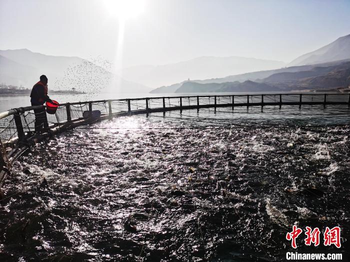 圖為尖扎縣黃河水面養(yǎng)殖網(wǎng)箱里的鮭鱒魚。 張?zhí)砀?攝