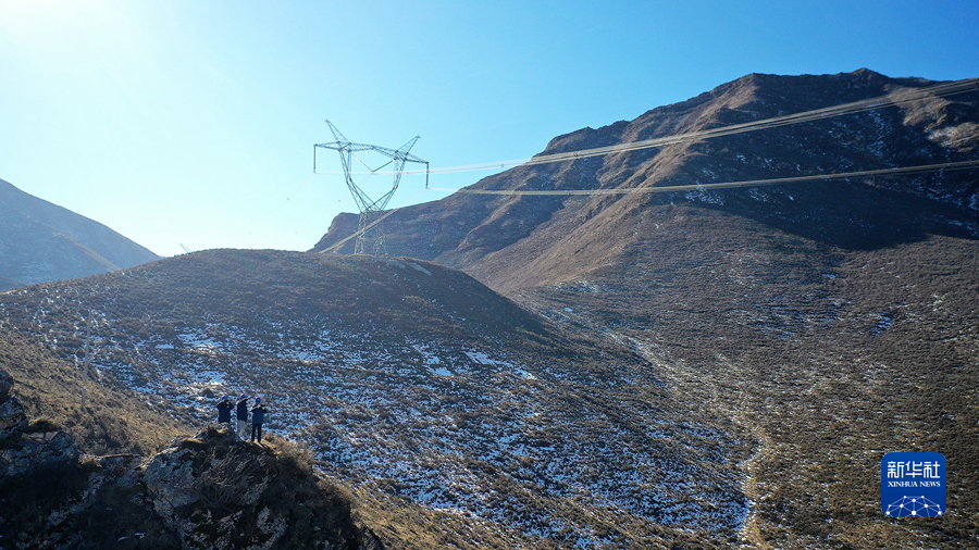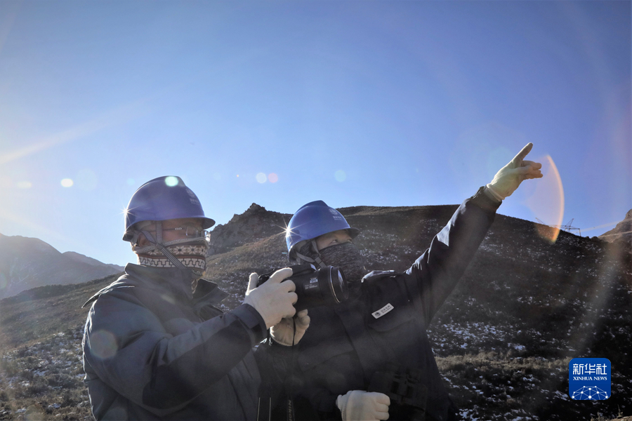 1月19日,國家電網(wǎng)青海省電力公司檢修公司輸電檢修中心專業(yè)班組成員在巡線途中查看線路運(yùn)行情況。新華社記者 趙玉和 攝