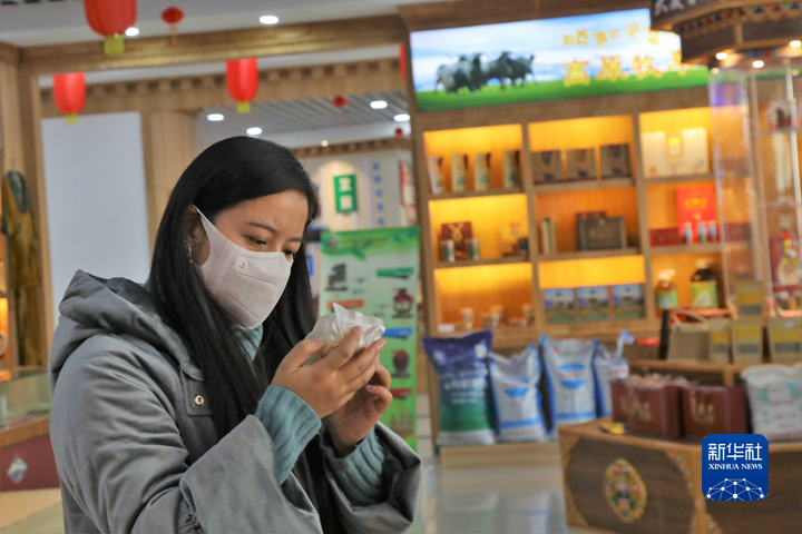 1月25日,消費(fèi)者在青海省海南藏族自治州精準(zhǔn)扶貧綠色產(chǎn)業(yè)發(fā)展園選購(gòu)年貨。新華社 央秀達(dá)珍 攝