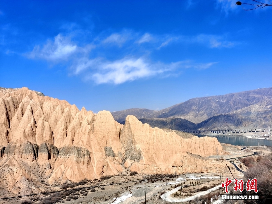 圖為2月22日在青海省尖扎縣黃河岸畔拍攝的丹霞地貌。中新社記者 張?zhí)砀?攝