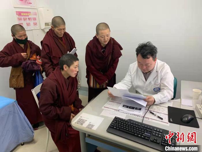 王文濤為藏族患者診治?!∈茉L者供圖