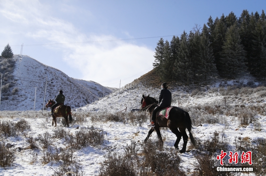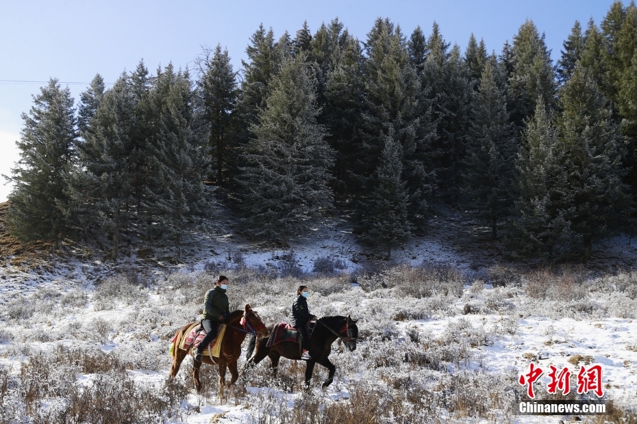 3月17日,位于祁連山腹地的青海省海北藏族自治州祁連縣,女子管護隊員們騎馬巡山。 中新社記者 馬銘言 攝