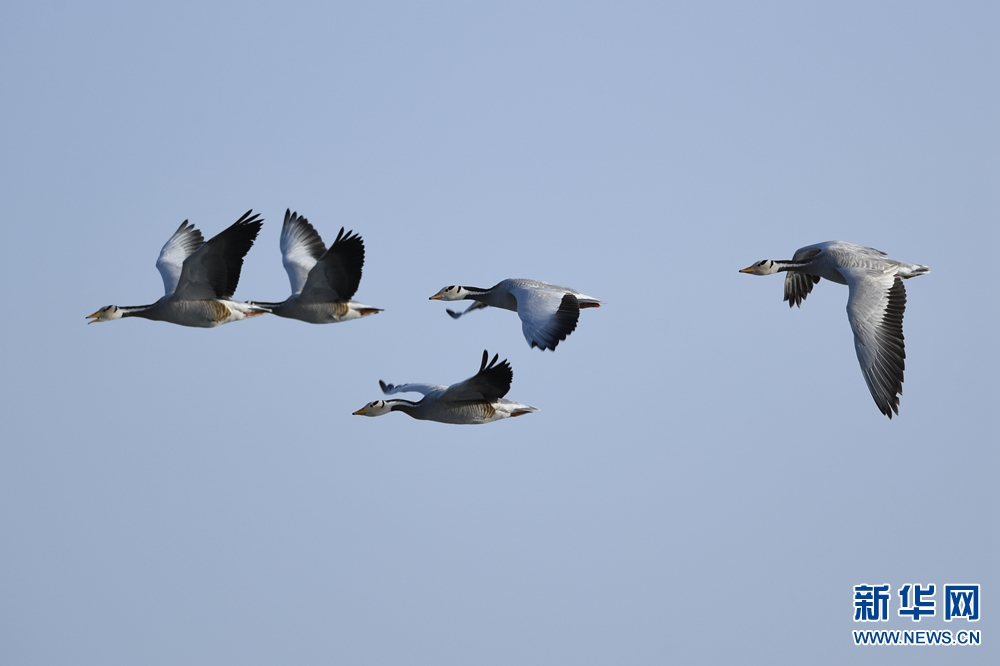 斑頭雁在青海湖上空飛過(guò)。新華網(wǎng) 潘彬彬 攝