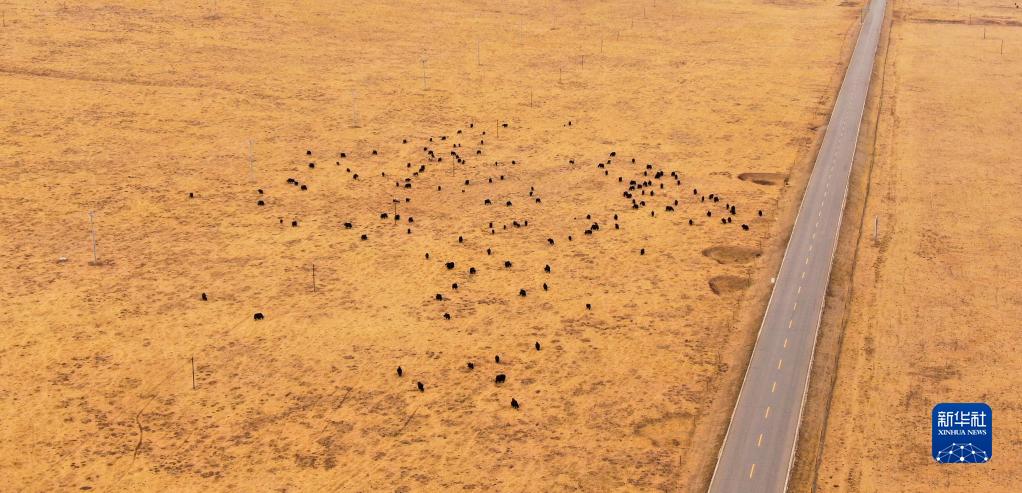 3月31日,在青海省黃南藏族自治州河南蒙古族自治縣,一群牦牛在草原上吃草(無(wú)人機(jī)照片)。新華社記者 王艷 攝