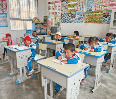 2017年,隨著易地扶貧搬遷政策的落實,越來越多村民選擇搬到山腳開始新的生活。學(xué)校里的孩子們由32名減少到9名?!?個孩子有7個是留守兒童,最大的8歲,最小的3歲。”完么仁增把黑板分成兩塊,左邊是一年級,右邊是學(xué)前班,“安排了語文、數(shù)學(xué)、美術(shù)、道德與法治4門課,采用復(fù)式班的教學(xué)模式”。
