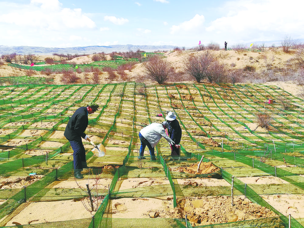 陶銳說:“比如在流動(dòng)半流動(dòng)沙丘,我們將工程固沙與生物治沙相結(jié)合。在迎風(fēng)面設(shè)置1.5m×1.5m的草方格沙障,在設(shè)置好的草方格沙障內(nèi)栽植青楊,進(jìn)行烏柳插桿并點(diǎn)播檸條沙蒿等,而在背風(fēng)坡實(shí)行插桿造林。在丘間地,我們則采取植苗造林,栽植烏柳苗和沙棘苗,并用網(wǎng)圍欄進(jìn)行封育等?!?/p>