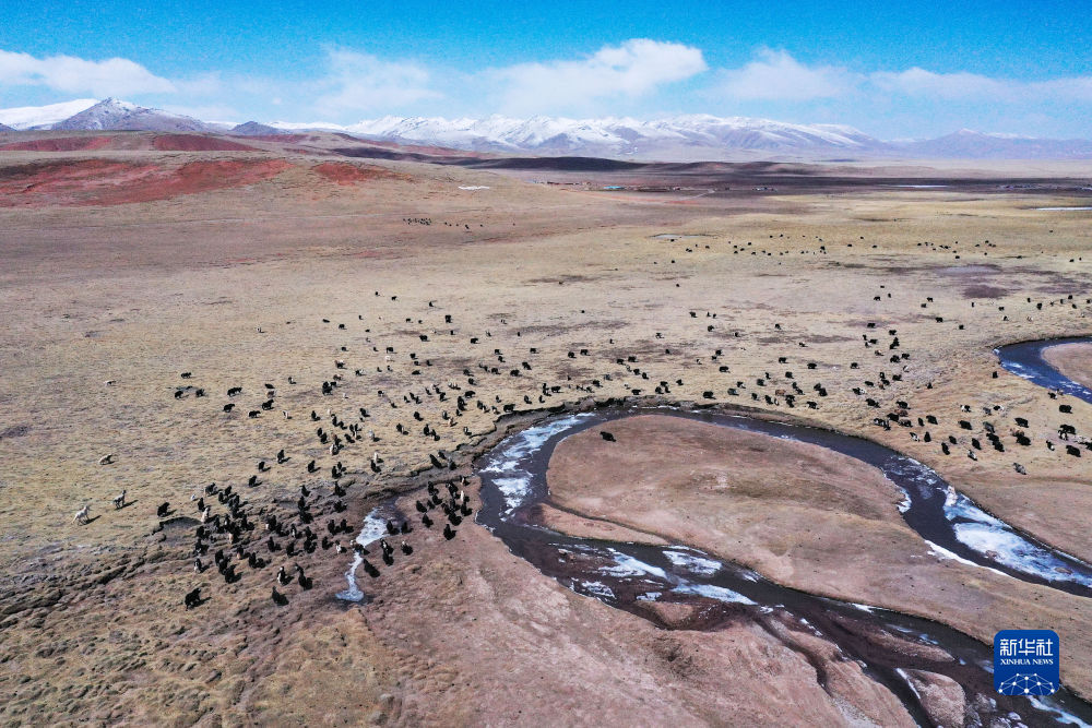 4月19日,在青海省玉樹藏族自治州曲麻萊縣,牦牛在草原上覓食(無(wú)人機(jī)照片)。新華社記者 張龍 攝