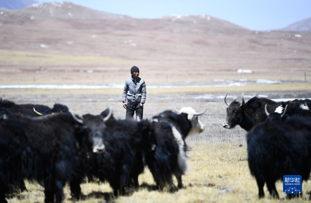 4月20日,在青海省玉樹藏族自治州曲麻萊縣,牧民在放牧。新華社記者 張龍 攝