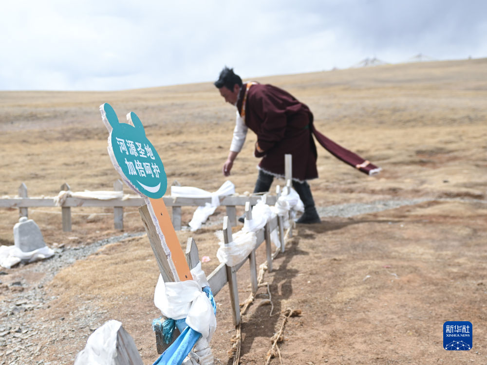 4月21日,在青海省玉樹藏族自治州曲麻萊縣麻多鄉(xiāng)約古宗列曲附近,生態(tài)管護(hù)員格桑東周在整理黃河源頭的柵欄。新華社記者 張龍 攝