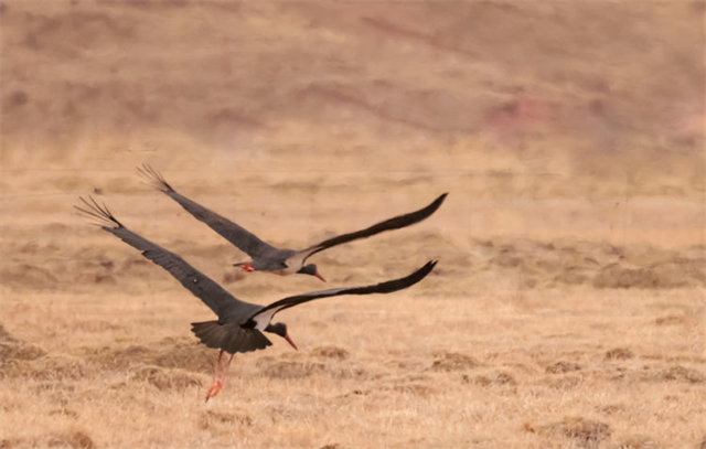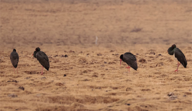 近日,有攝影師在祁連山國家公園亂海子濕地拍攝記錄到4只國家一級重點保護(hù)野生動物——黑鸛,它們時而低頭覓食、時而展翅飛翔。黑鸛是一種體態(tài)優(yōu)美、體色鮮明、性情機(jī)警的大型涉禽,屬世界瀕危鳥類之一,在中國僅有1000多只,珍稀程度不亞于大熊貓,因此也有“鳥中大熊貓”之稱。