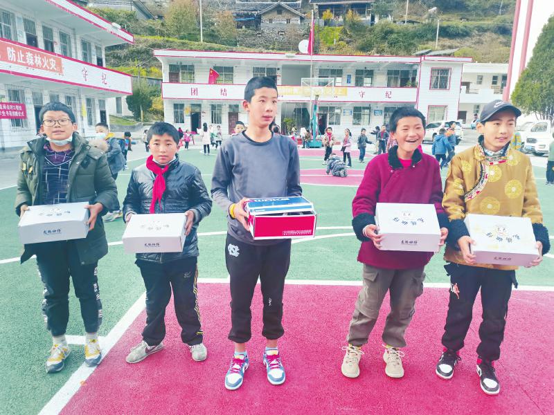 去年11月12日,在九龍縣三巖龍鄉(xiāng)小學(xué),由青白江區(qū)彌牟鎮(zhèn)物流商會捐贈(zèng)的86雙加絨運(yùn)動(dòng)鞋送到了學(xué)生們的手中。三巖龍鄉(xiāng)平均海拔3300米,冬季氣溫低,“這下不用擔(dān)心學(xué)生們凍腳了?!痹撔PiL駱朝文說。