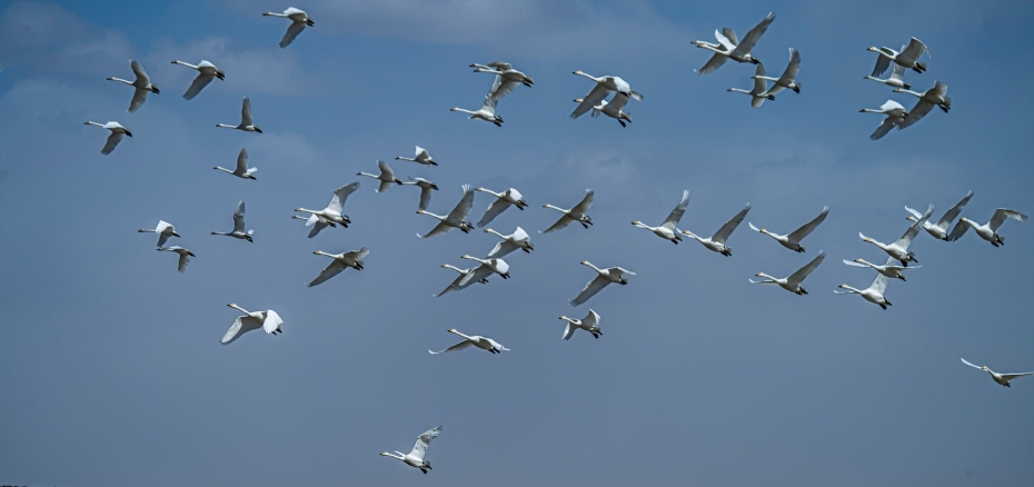 隨著天氣轉(zhuǎn)暖,青海省海南藏族自治州共和縣塘格木鎮(zhèn)更尕海又迎來了一大批候鳥。大天鵝,黑頸鶴以及白鷺、大雁、赤麻鴨等10多種候鳥回歸,它們一會兒在天空中飛翔,一會在岸邊棲息,一會兒又沖向水中捉魚覓食,在這綠水青山的環(huán)境里好不愜意。共和縣融媒體中心 供圖
