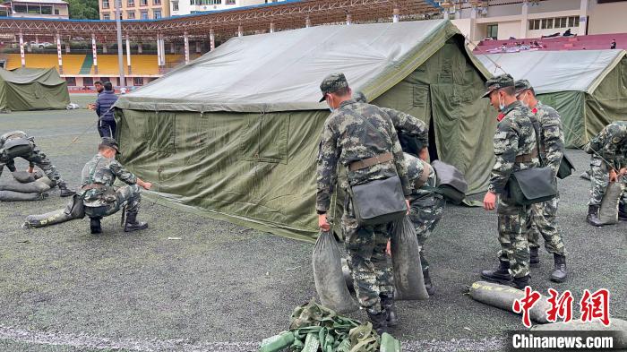 記者10日從四川省阿壩州委宣傳部獲悉,6月10日凌晨,四川阿壩州馬爾康市多次地震發(fā)生后,武警四川總隊阿壩支隊第一時間趕到震區(qū)周邊居民密集區(qū)域,擔(dān)負(fù)搭建安置點、安撫群眾、巡邏執(zhí)勤等任務(wù)。今天清晨五點,災(zāi)區(qū)又出現(xiàn)降雨天氣,武警官兵們在馬爾康市城區(qū)應(yīng)急避難場所,緊急搭建帳篷。