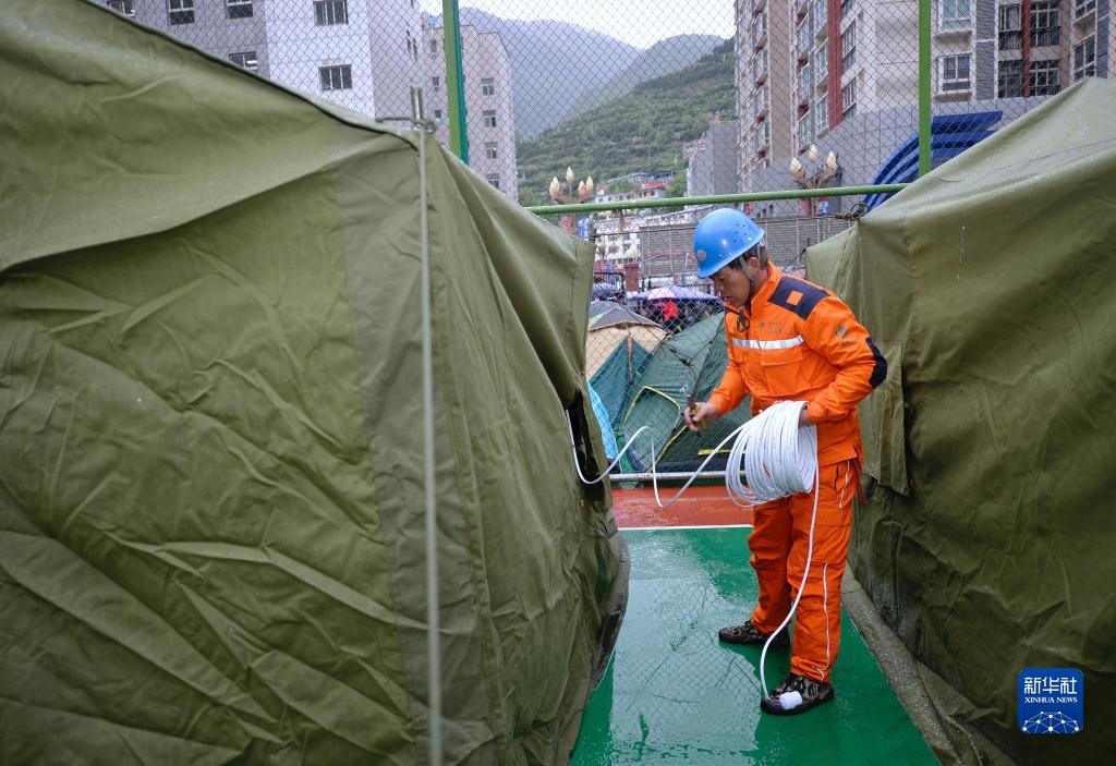 6月10日,在馬爾康市州醫(yī)院背后廣場(chǎng)安置點(diǎn)內(nèi),國(guó)家電網(wǎng)工作人員在鋪設(shè)電線。新華社記者 劉坤 攝