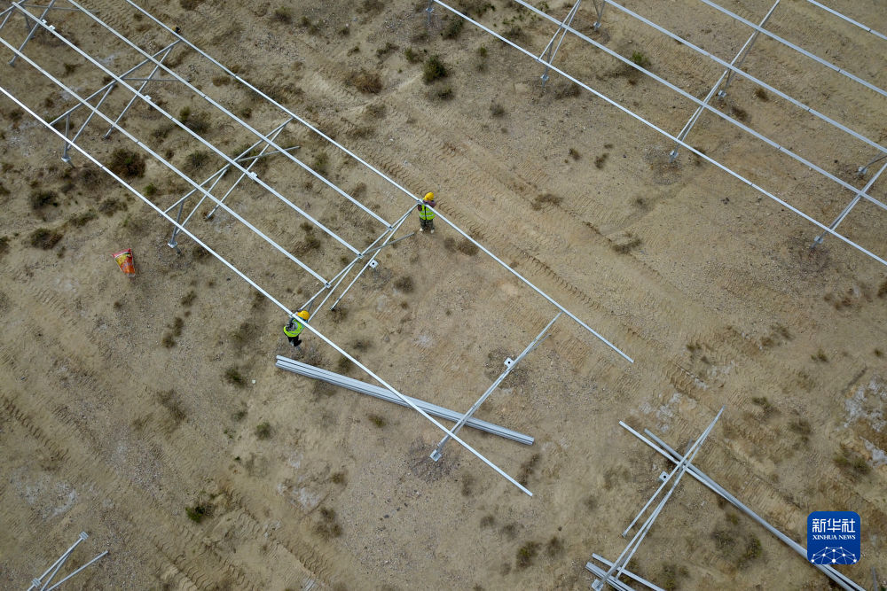6月7日,在國家電投集團(tuán)黃河公司德令哈220萬千瓦多能互補(bǔ)項(xiàng)目一期100萬千瓦光伏項(xiàng)目建設(shè)現(xiàn)場,工人安裝光伏支架(無人機(jī)照片)。新華社記者 范培珅 攝