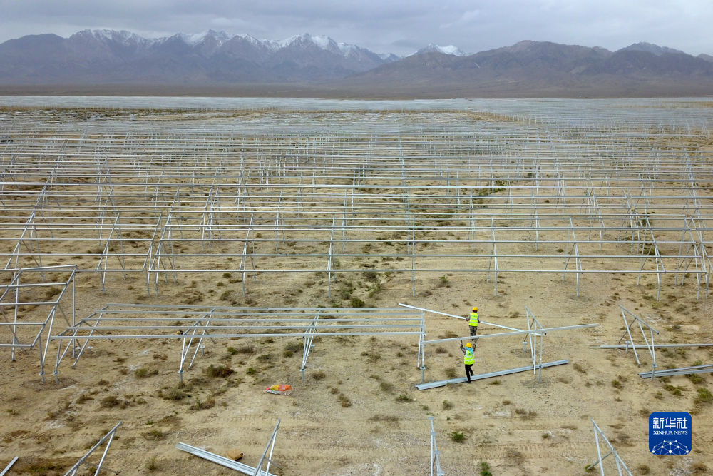 6月7日,在國家電投集團(tuán)黃河公司德令哈220萬千瓦多能互補(bǔ)項(xiàng)目一期100萬千瓦光伏項(xiàng)目建設(shè)現(xiàn)場,工人安裝光伏支架。新華社記者 范培珅 攝