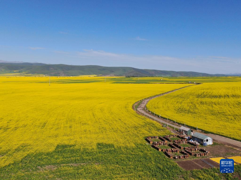 進(jìn)入七月,位于青海省海北藏族自治州門源回族自治縣的萬畝油菜花競(jìng)相綻放。來自四川德陽的蜂農(nóng)馮躍宣在花海里忙碌。他從早上7點(diǎn)開始整理蜂箱、采集花粉、晾曬花粉,一直忙碌到晚上8點(diǎn)。