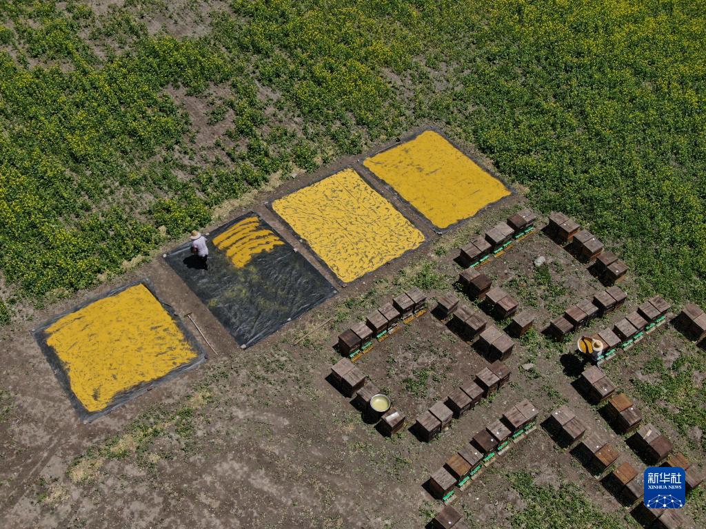 7月3日,在青海省海北藏族自治州門源回族自治縣,馮躍宣在晾曬花粉(無人機(jī)照片)。新華社記者 張龍 攝