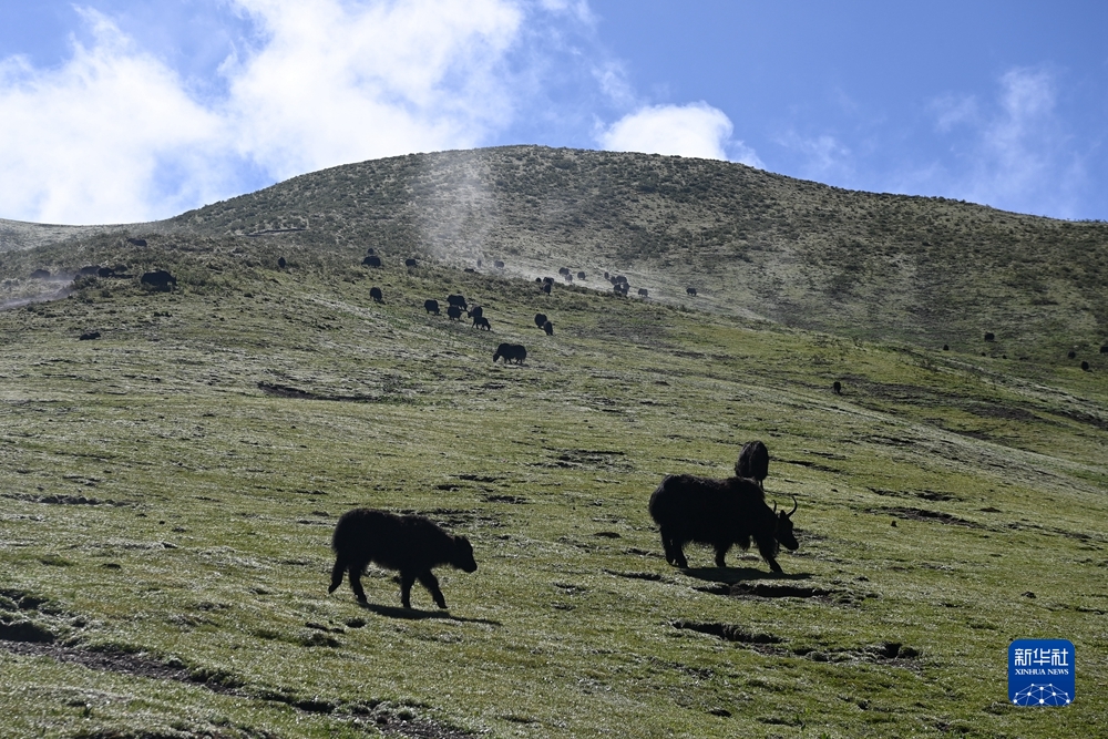 這是7月22日在甘德縣柯曲鎮(zhèn)貢麻溝拍攝的甘德縣生態(tài)畜牧業(yè)聯(lián)合社牦牛養(yǎng)殖基地。新華社記者 范培珅 攝