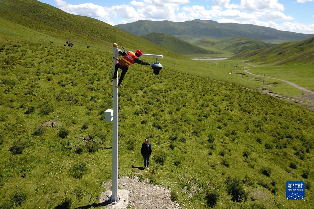 7月22日,在甘德縣生態(tài)畜牧業(yè)聯(lián)合社牦牛養(yǎng)殖基地,技術(shù)人員維護(hù)視頻監(jiān)控設(shè)備(無(wú)人機(jī)照片)。新華社記者 范培珅 攝